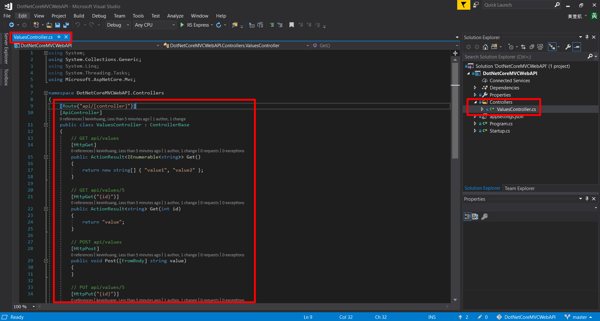 5.專案建立完成後,就可以看到Visual Studio已經幫我們建立了預設的Controllers/ValueController.cs,並且裡面已經有寫了一些基本的GET and POST Function。
