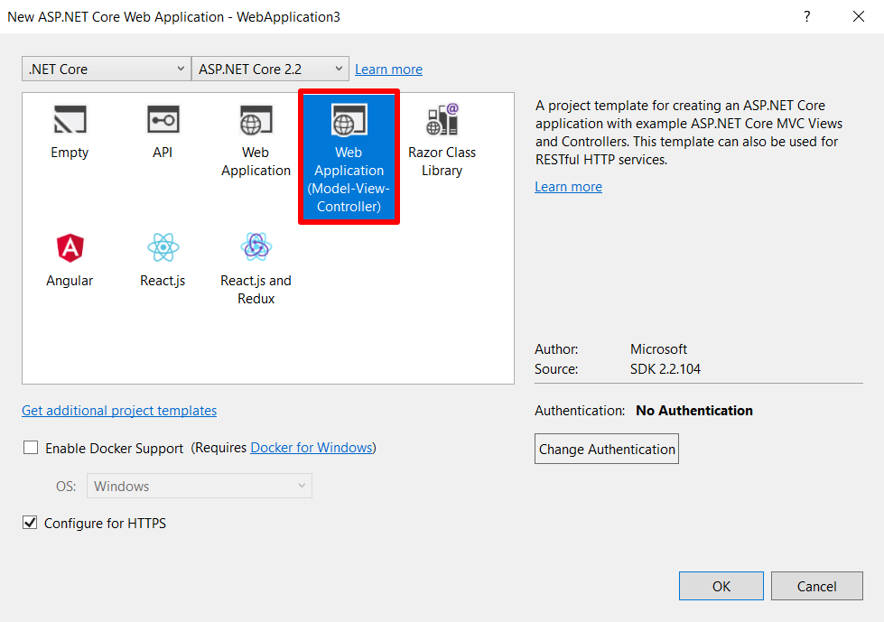 那麼假設我們建立的是Web Application(Model-View-Controller)的專案呢(如下圖)?我在建立專案前,也有想嘗試建立這個專案類型,想說有MVC架構,之後再把它寫成WEB API的格式。