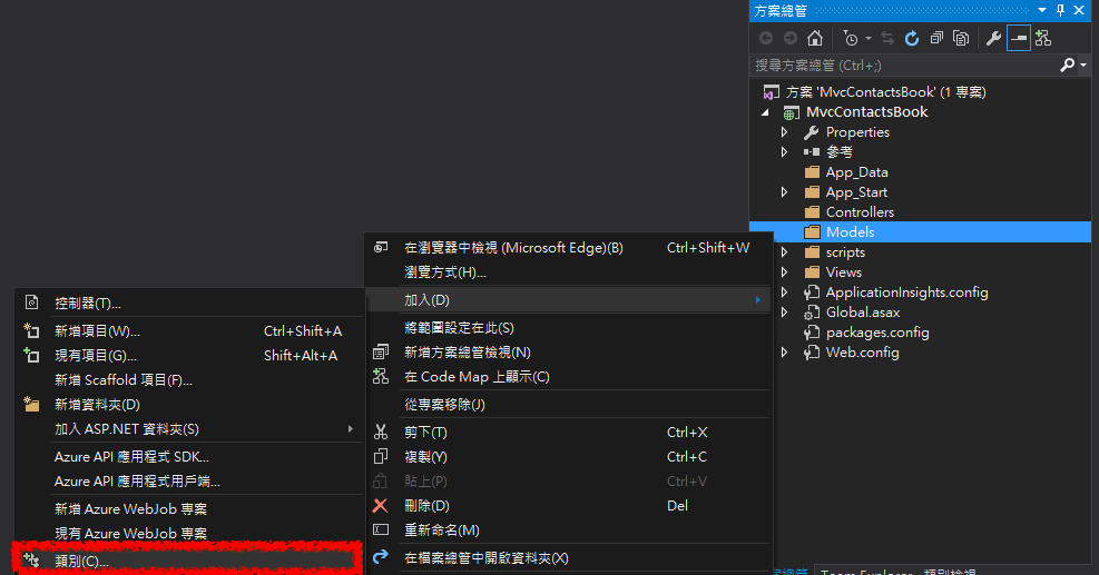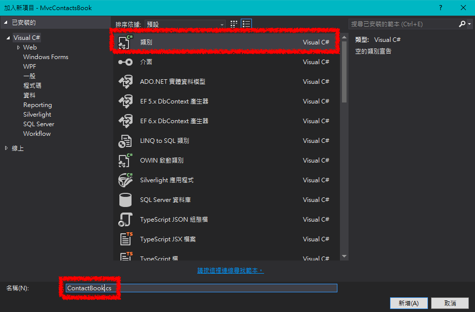 ✏️ 方案總管 -> 在Model資料夾右鍵加入一個類別 -> 取名為 ContactBook.cs -> 新增