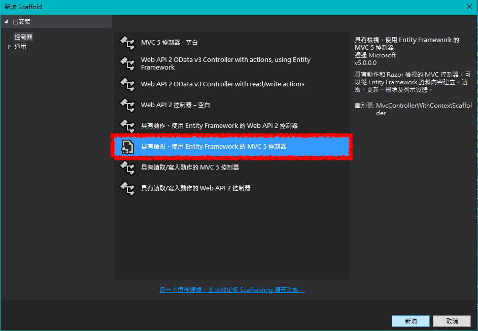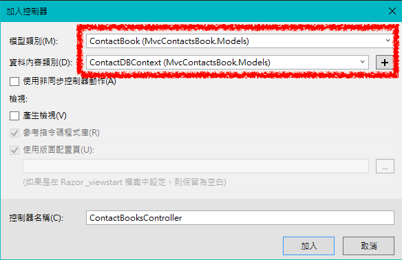 ✏️ 用下拉選單選擇:模型類別ContactBooks(MVCContactsBookModels),資料內容型別ContactDBContext(MVCContactBookModels) -> 名稱會自動取名為ContactBooksController ->加入