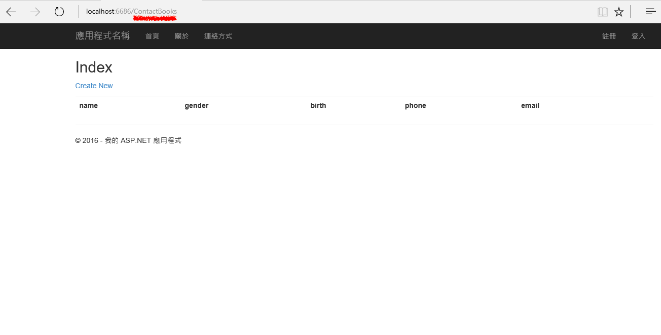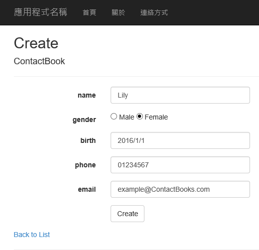由於我們使用剛剛Controller自動建立的網頁他已經包含聯絡人新增、刪除、修改的頁面,但是為了方便使用者輸入,還需要做一些微微的調整