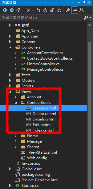 ✏️ 打開方案總管中,Views 資料夾 -> ContactBooks資料夾 -> Create.cshtml