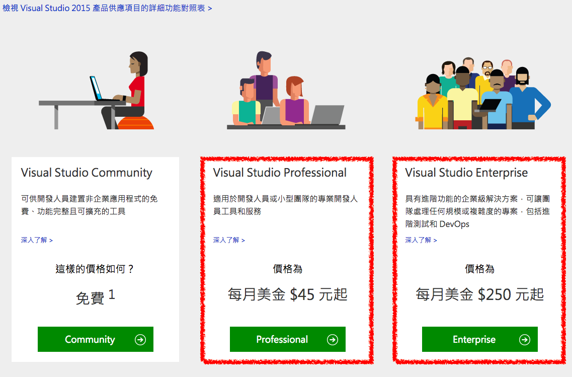 ◎首先,我們要先有 Visual Studio Enterprise/Professional 作為開發環境,可以到官網下載(下圖紅框部分,可以試用)