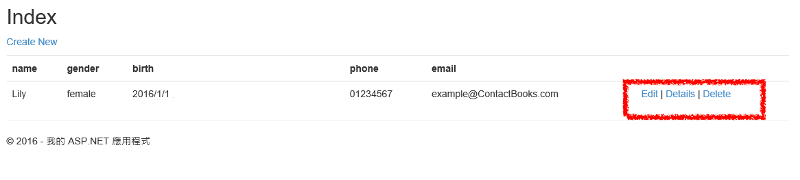 ✏️ 在總瀏覽頁面localhost:xxxx/ContactBooks裡還可以編輯、檢視詳細資訊、刪除每一筆連絡人