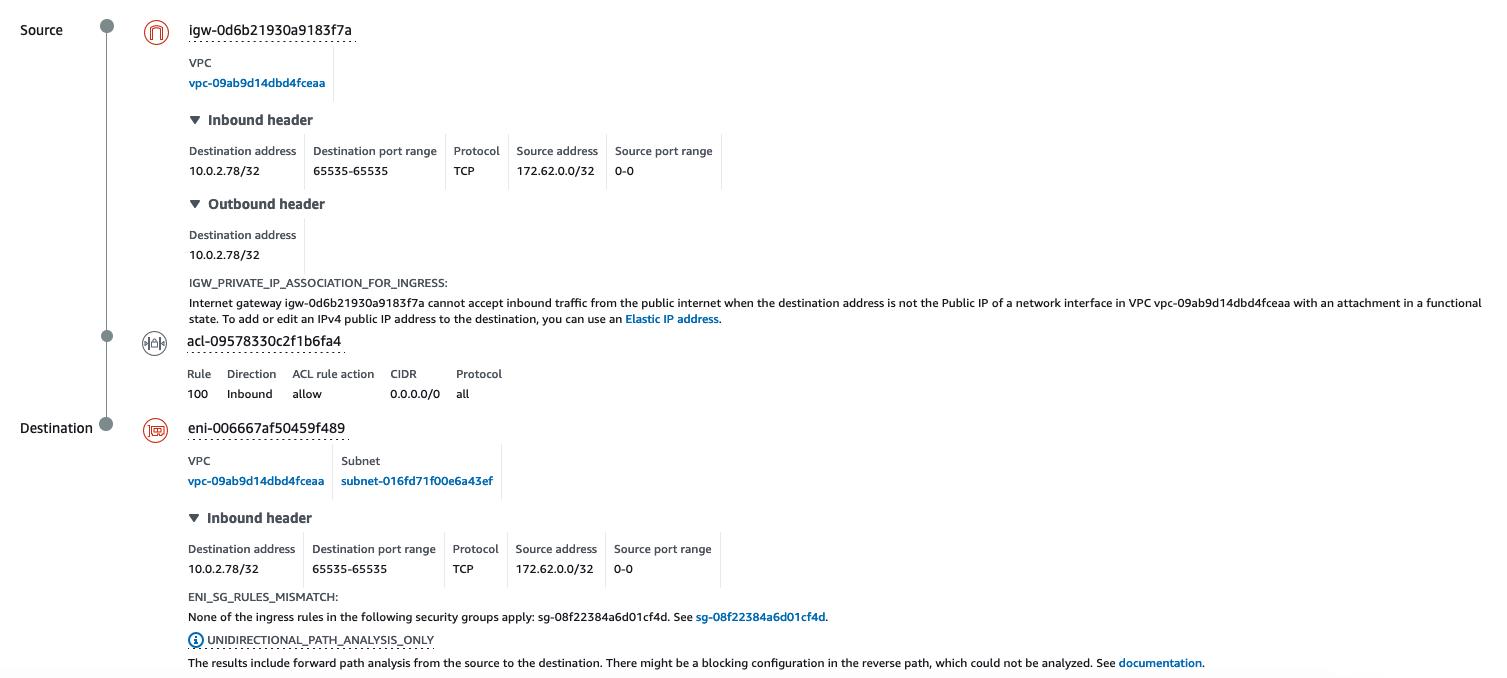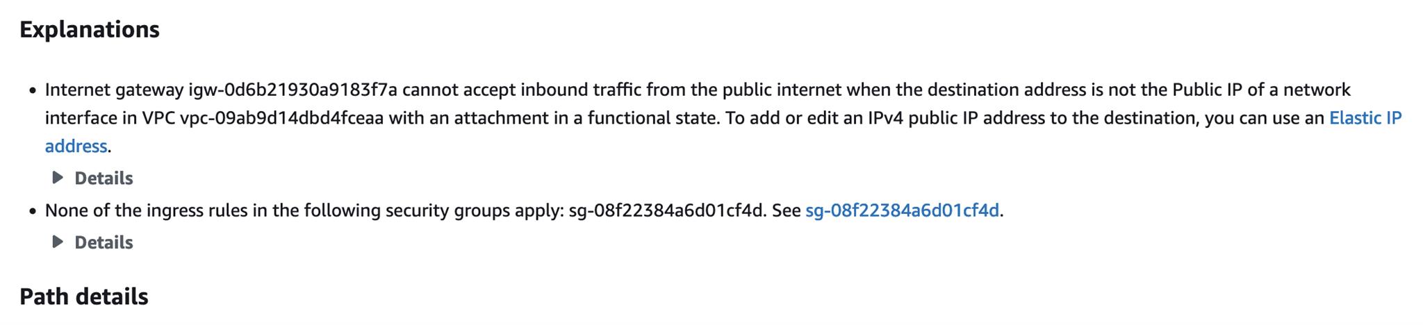 如果無法連通,也能知道原因,以及封包是在哪個關卡過不了。以這張圖為例,就可以知道外面的網路無法連到這張網卡的原因是 ENI 網卡沒有 public IP 且 security group 內沒有允許該連線