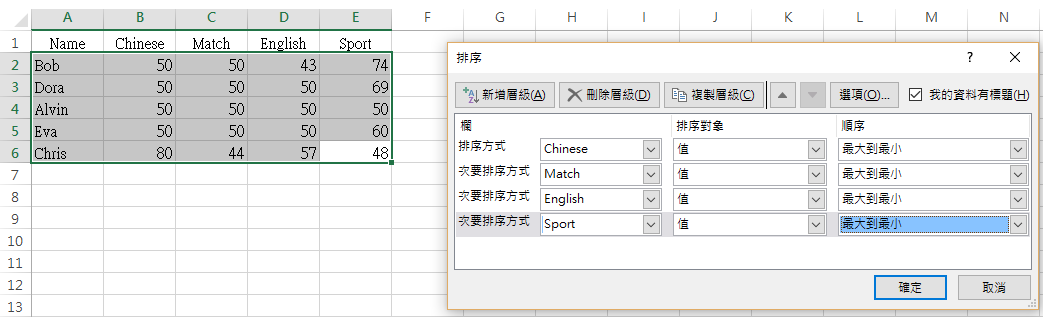 [{'Chinese': 80, 'English': 57, 'Math': 44, 'Name': 'Chris', 'Sport': 48},