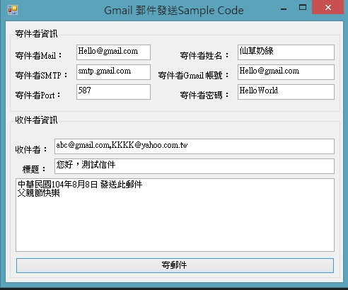 1. 寄件者SMTP : google的位址為 smtp.gmail.com 如果要使用其他郵件服務需要修改