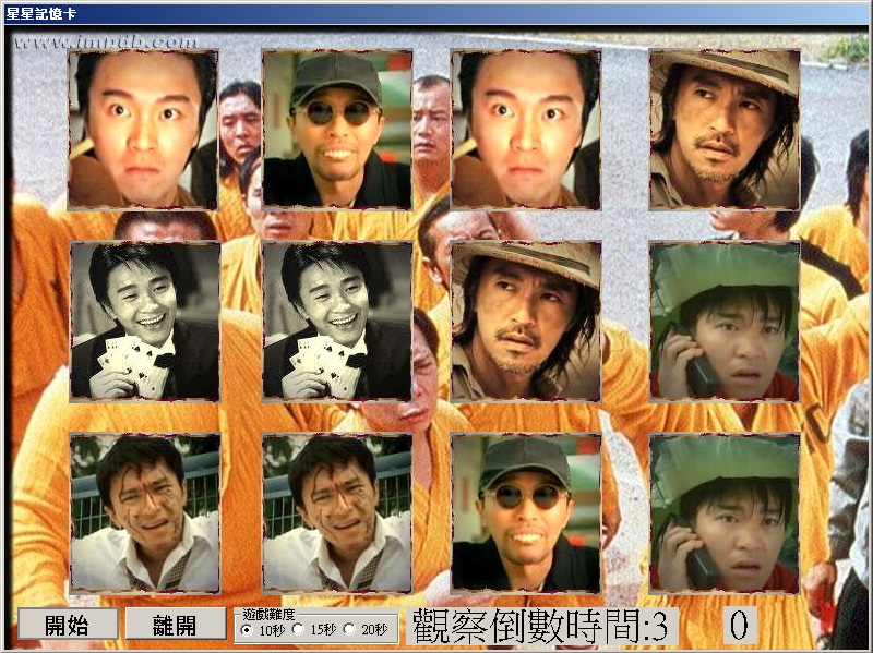 2016-09-03 0011. 記憶卡片遊戲-周星馳電影主題 8936 0 C#學習筆記 2017-11-02 C#學習筆記 剛上研究所時自修程式,閒暇之餘寫出來的小品遊戲。說明如下: 開啟程式MEMORY CARY.exe 檔案,會有兩個選擇 1.點擊左邊周星馳的臉進入遊戲 2.點擊右邊周星馳的臉離開遊戲 進入遊戲後左下角會有開始跟離開的按鈕 遊戲難度為中間讀秒的地方有分10秒、15秒、20秒 按下開始後會先倒數3秒看所有牌面的位置,然後會翻面。玩家找出位置即可。 遊戲下載位置: 點我下載 C# 回首頁