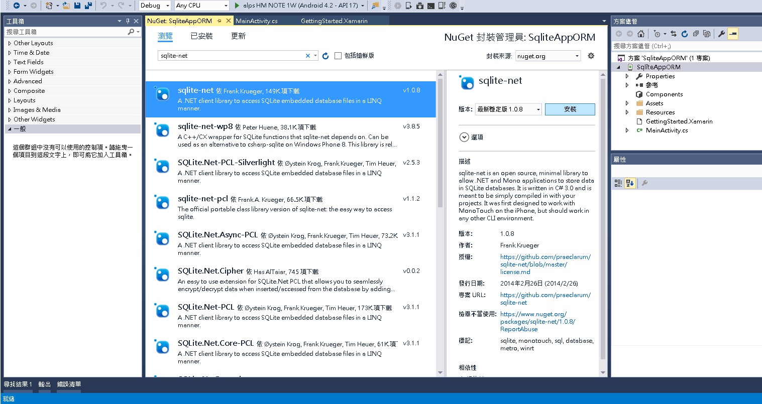 3. 在瀏覽 -> 搜尋 sqlite-net 關鍵字 ->然後安裝該項目