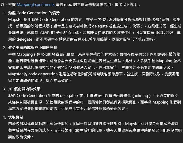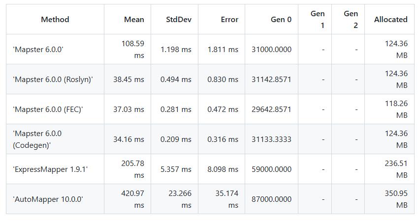 有關各個 Mapping 工具的效能比較,除了 Mapster 在 Github Repo 裡所提供那張表之外,也另外找到了一篇文章,而且還有提供原始碼,所以有興趣的可以去做個瞭解。