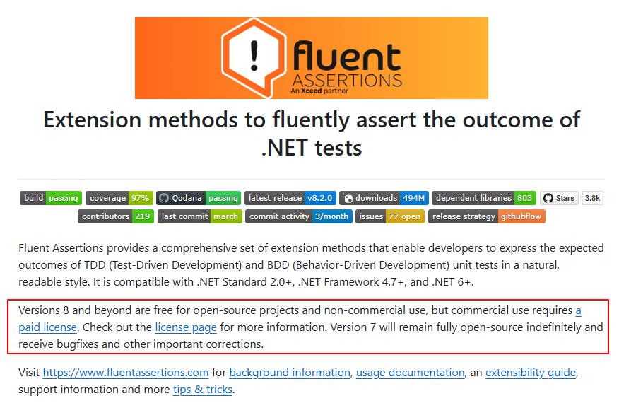 - 新版 FluentAssertions(8.x、9.x…)都需付費授權才能用於商業開發或測試