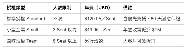 按人頭計費:使用者(開發、測試人員)皆需擁有授權。