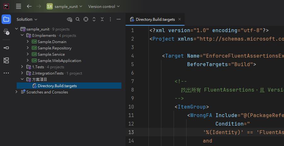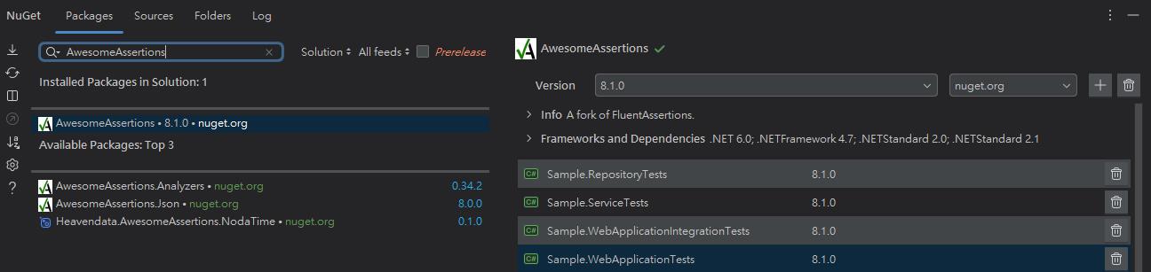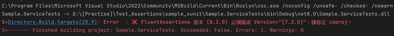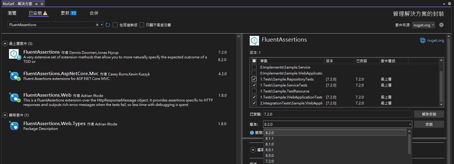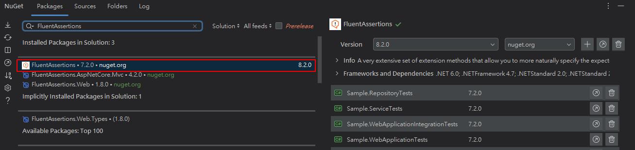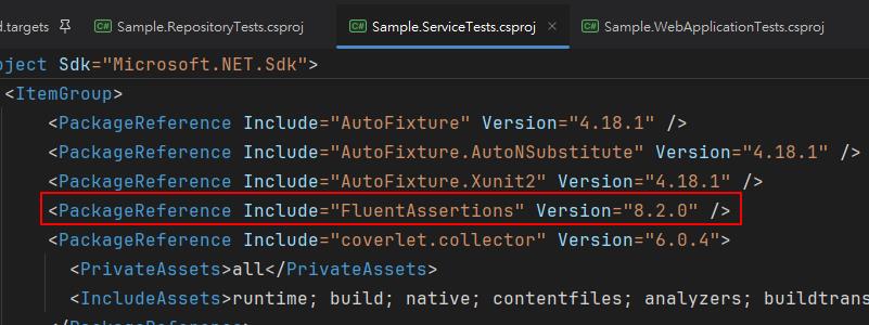 例如我將 Sample.ServiceTests.csproj 裡的 Fluent Assertions 改為 8.2.0