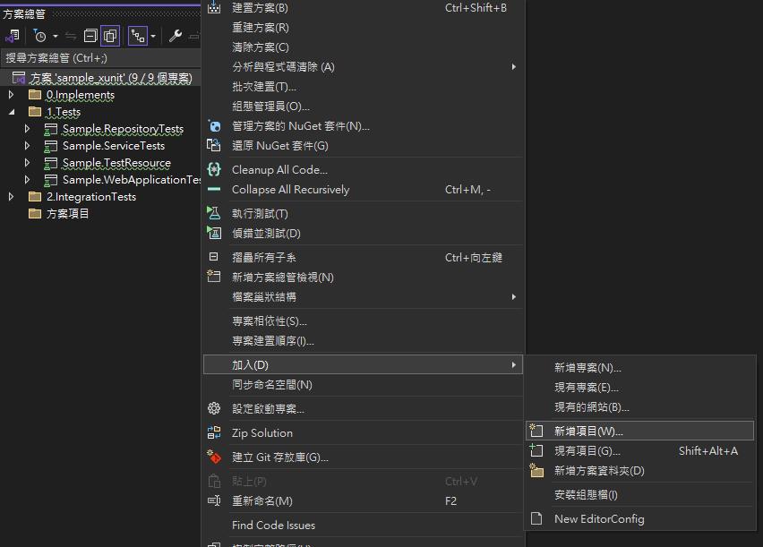 因為不用刻意將Directory.Build.targets檔案加入至.sln檔案裡,所以很容易會遺忘它(務必要將這個檔案加入到版本控管),這邊可以透過兩種方式將Directory.Build.targets檔案加入為方案項目,這樣就可以在方案總管裡看到檔案,而且也方便之後的修改編輯。