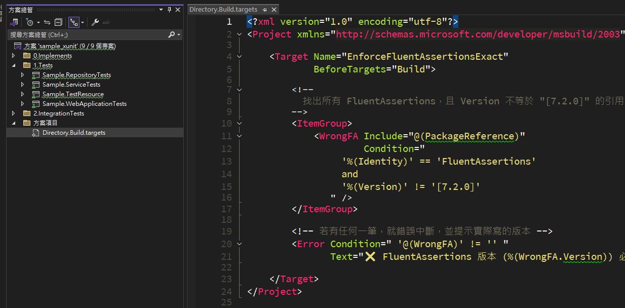 之後如果 Fluent Assertions 在 7.x 還有發佈錯誤修復的新版本,就去修改Directory.Build.targets檔案裡的 Fluent Assertions 為新的版本號,重新建置方案後就會經由建置的錯誤訊息得知有哪幾個專案要做調整。