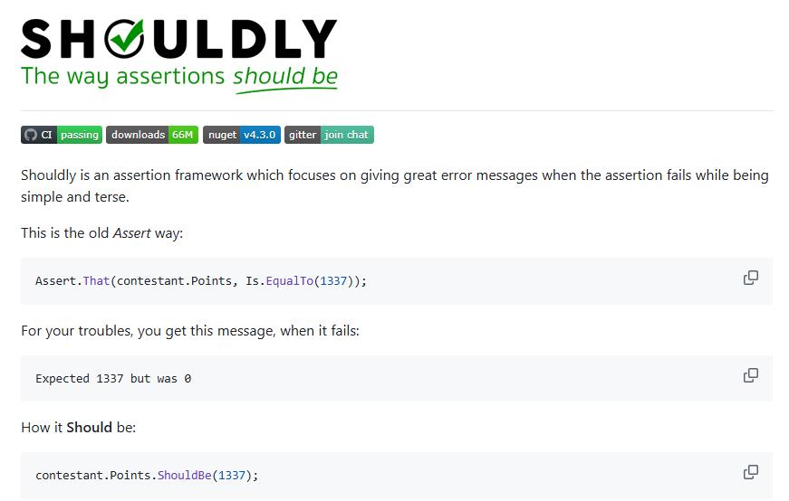 其實之前除了 Fluent Assertsions 外,還有很多人選用 Shouldly 這個套件,一直沒有在專案裡使用過,直到得知 Fluent Assertsions 於版本 8.x 之後要買授權後,我將手邊測試專案改用 Shouldly。是可以達到同樣驗證的目的,但是很多 assertions 語法的使用和擴展性、豐富性等等都不及 Fluent Assertions,畢竟也用了快十年,要短時間裡去適應另外一個套件是很困難。