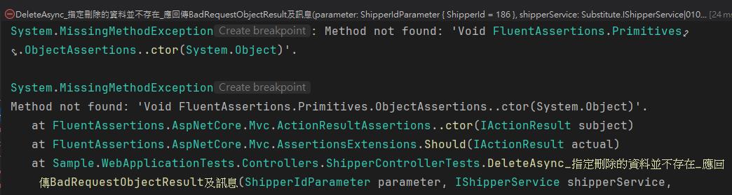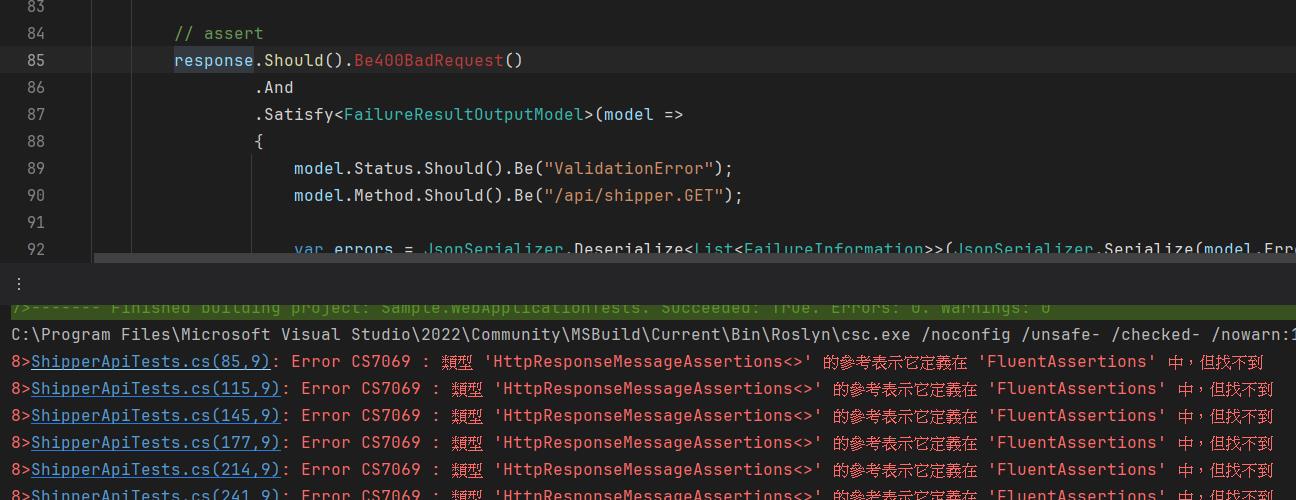 上面介紹到 FluentAssertions.Web,接著就在 Sample.WebApplicationIntegrationTests 整合測試專案裡出現了以下的錯誤