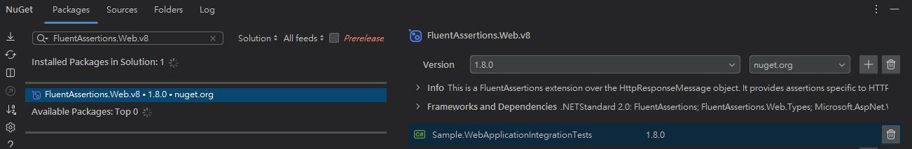 將 Sample.WebApplicationIntegrationTests 整合測試專案裡的 FluentAssertions.Web 1.8.0 移除,然後改為安裝 FluentAssertions.Web.v8 (1.8.0)
