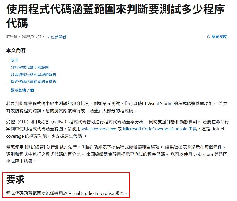 但是在 VIsual Studio 裡只有 Enterprise 這個版本才有內建程式碼覆蓋範圍的功能