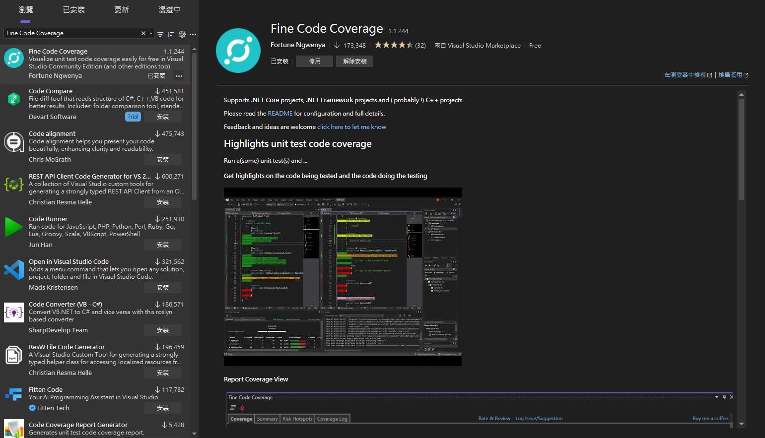 搜尋並安裝「Fine Code Coverage」,重啟 Visual Studio 後生效。