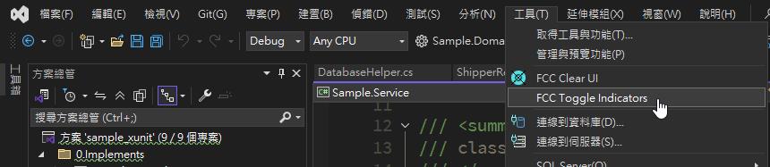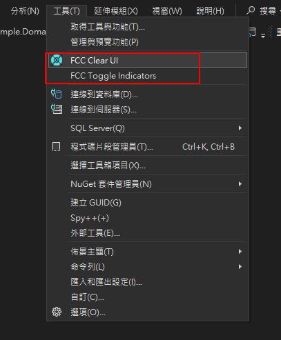 重啟 Visual Studio 後,可以在「工具」看到 FCC Clear UI 與 FCC Toggle Indicators