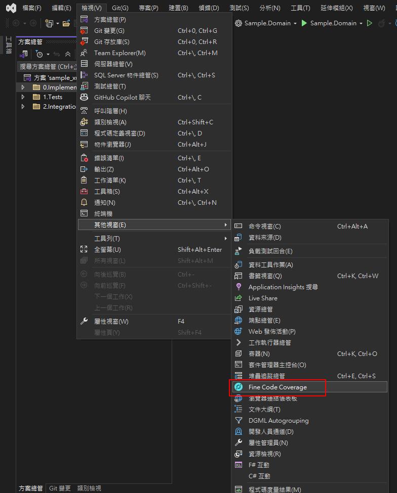 然後在「檢視」→「其他視窗」→「Fine Code Coverage」將 Fine Code Coverage 顯示出來