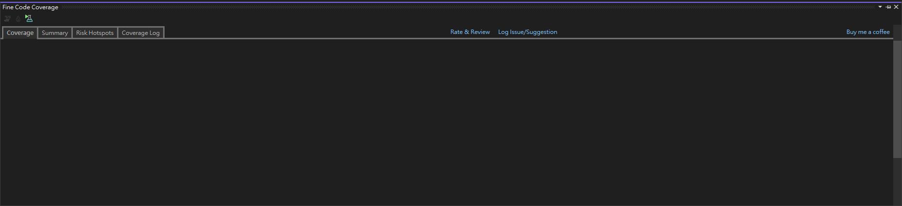 接著開啟 Fine Code Coverage 視窗,還是空空的,這是因為要產生 Code Coverage 報告是需要一點時間,會在所有測試都執行完畢後才會去產生 Code Coverage 報告,可以觀察輸出視窗的「測試」與「FCC」輸出來源