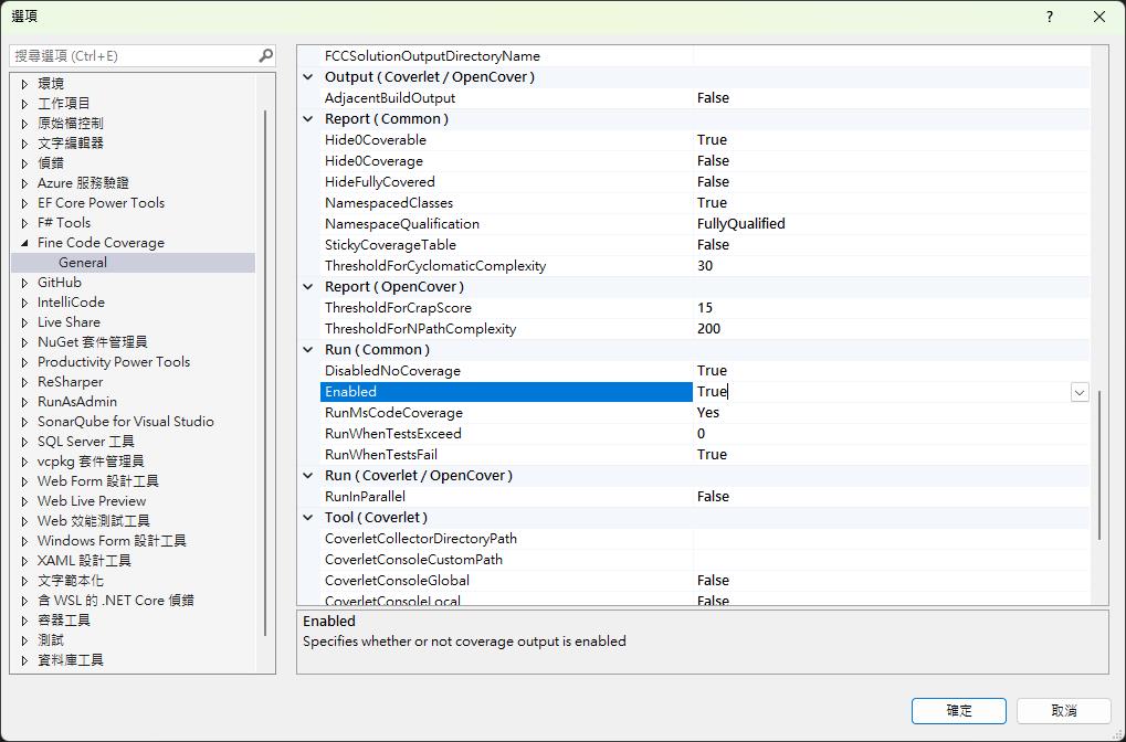 - 說明:如果你把它設為 False,即使按下「Run coverage」也不會啟動 Coverlet/OpenCover,也不會在編輯器顯示任何行號標記或產生報表;設為 True,Fine Code Coverage 才會在你執行測試時自動攔截並收集覆蓋率。