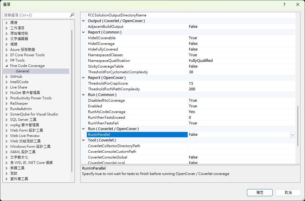 - 設為 True:Fine Code Coverage 不會等到測試全部結束,會在測試執行的同時,就平行啟動覆蓋率工具收集資料,通常可以縮短整體收集時間,但某些情境下(如工具注入延遲)可能會導致少數測試結果遺漏。