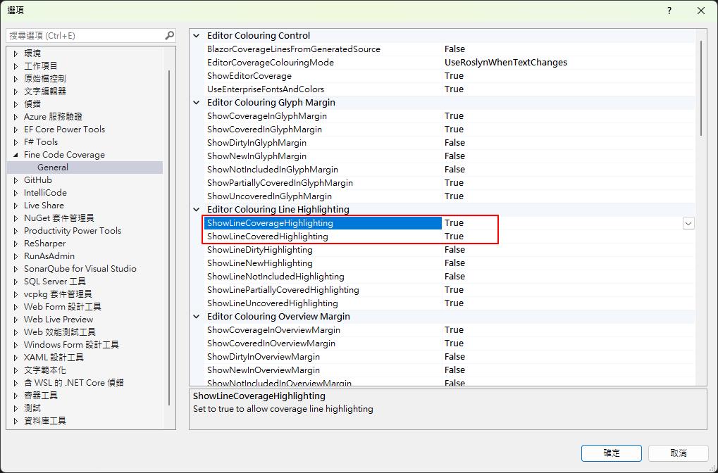 ShowLineCoveredHighlighting 控制「在原始碼編輯器中,對已被測試覆蓋的程式碼行,是否以底色(預設綠色)高亮顯示」
