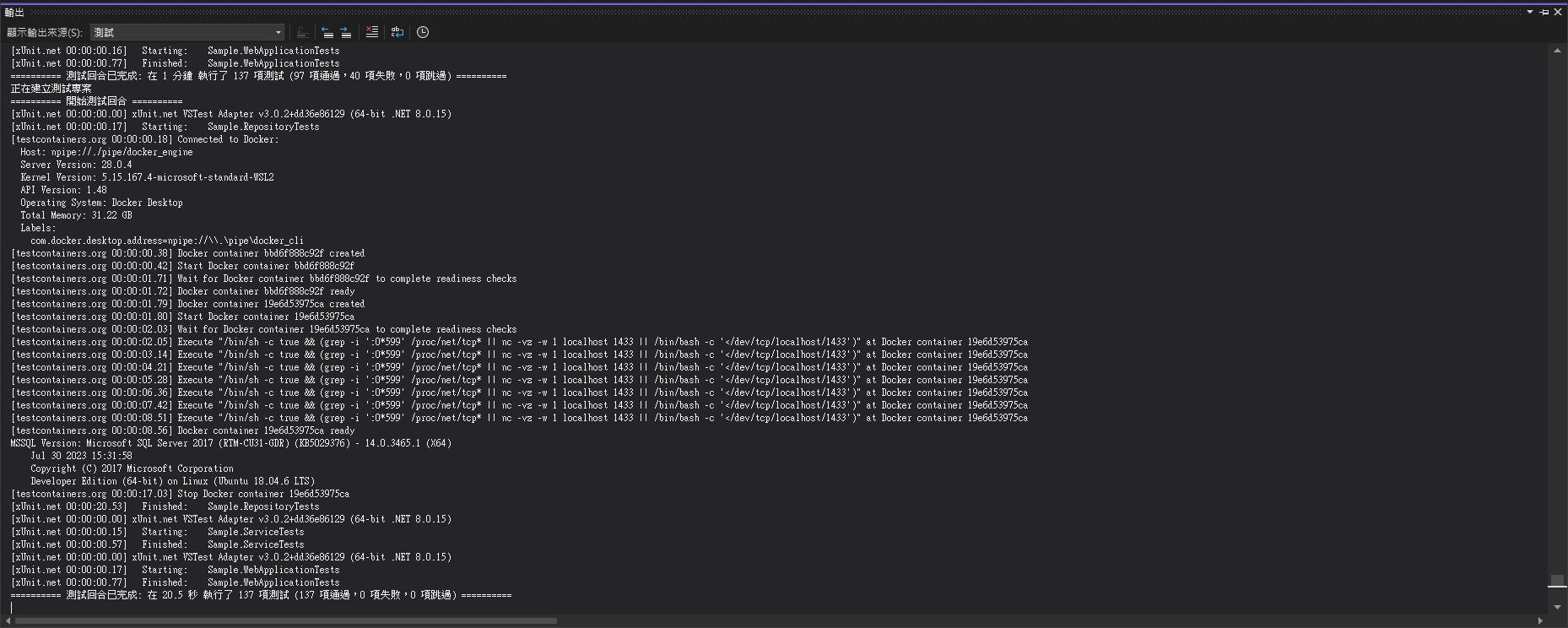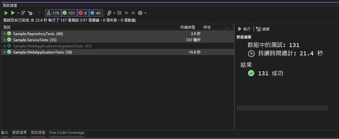 接著開啟專案、重新建置方案,然後執行所有單元測試(沒有執行的那個是整合測試專案)