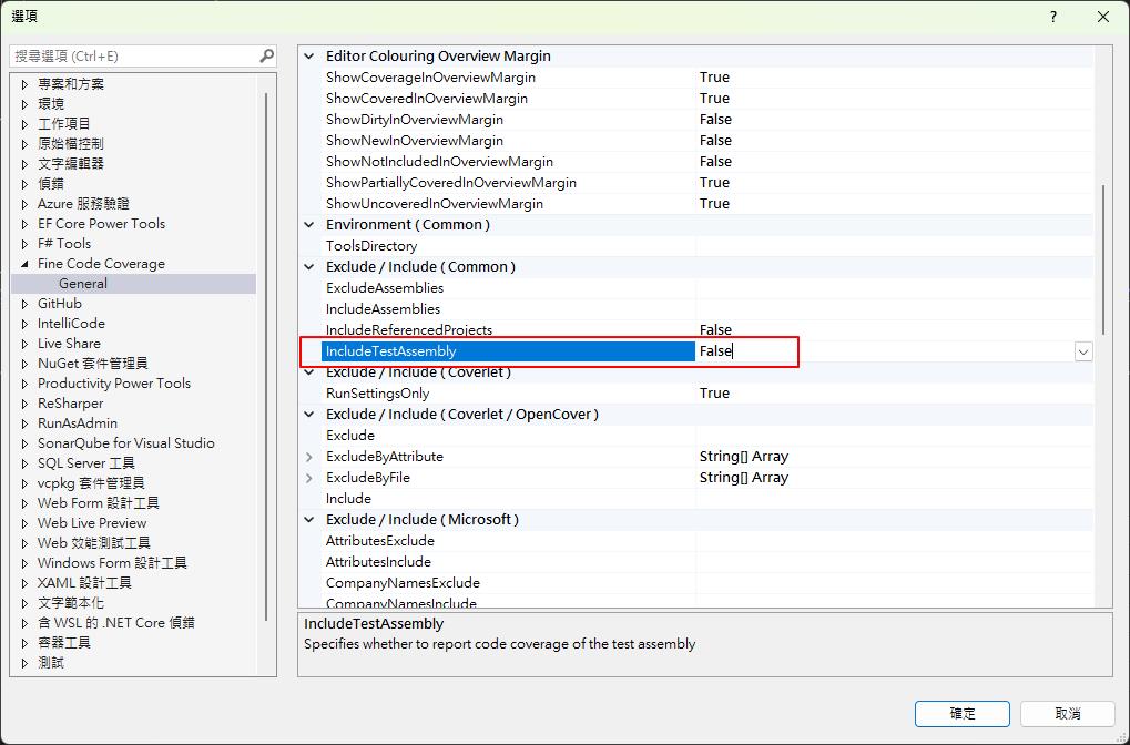 把測試專案 (測試組件,一般都會是 *Tests.dll) 裡的程式碼行(測試方法、輔助函式等等)納進覆蓋率報表。 - False(預設)