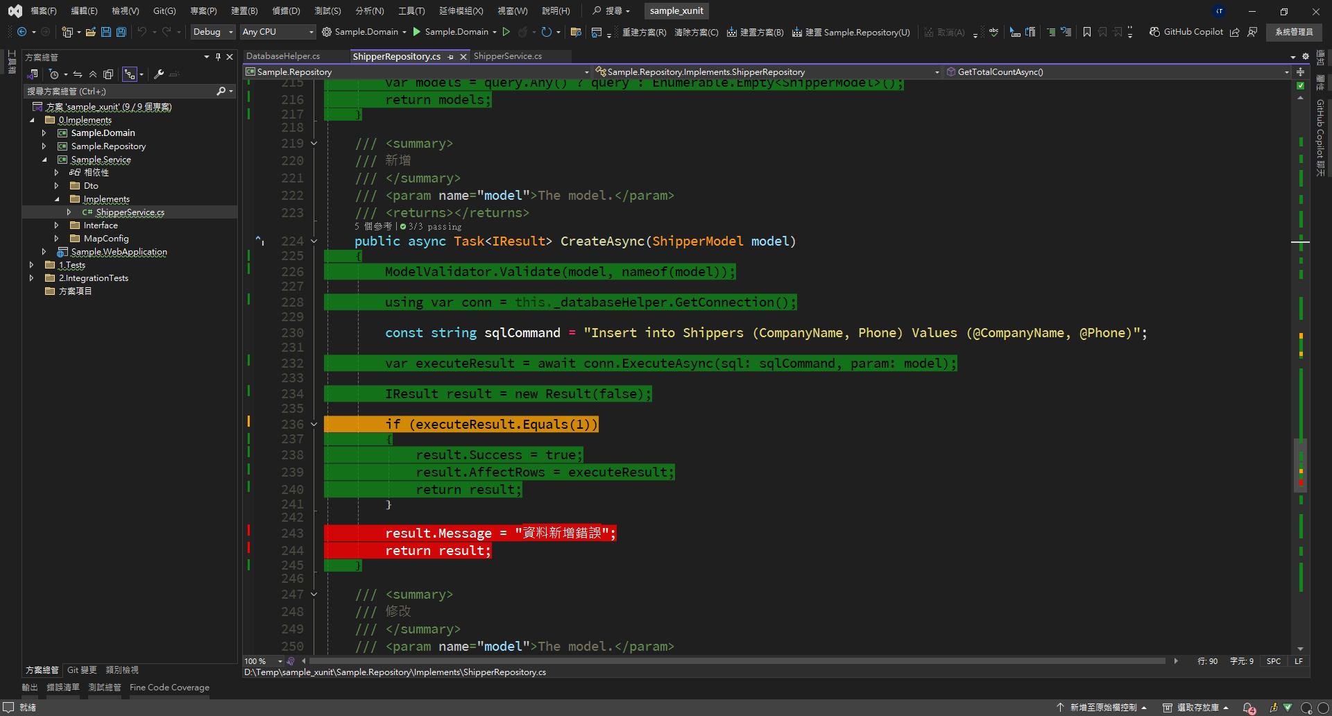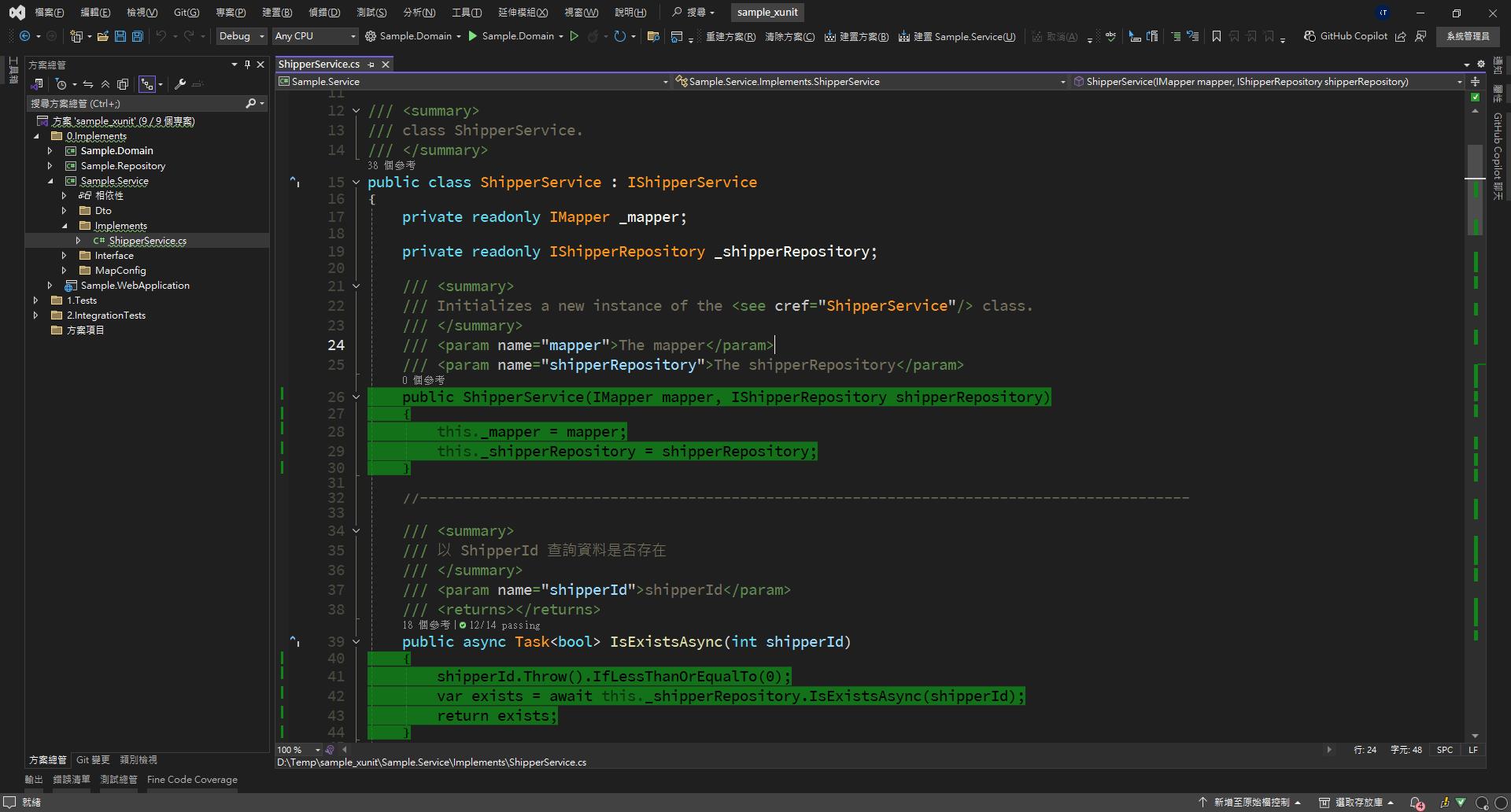 會自動開啟 ShipperService.cs,並且在 Editor 裡會以顏色標示程式碼是否有被測試所覆蓋