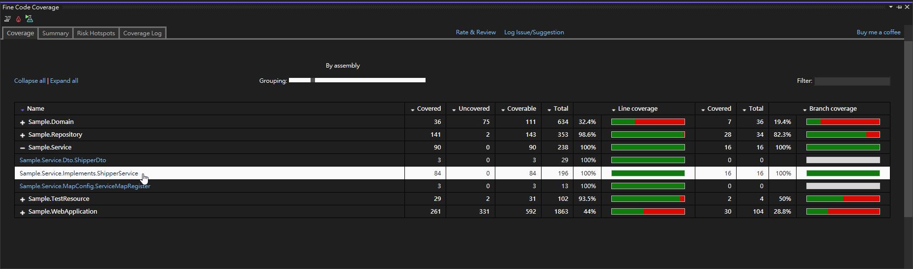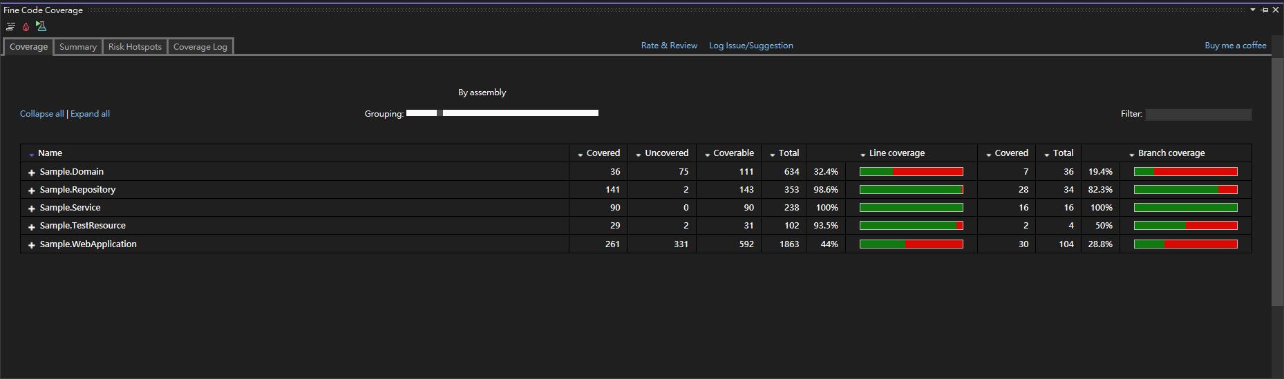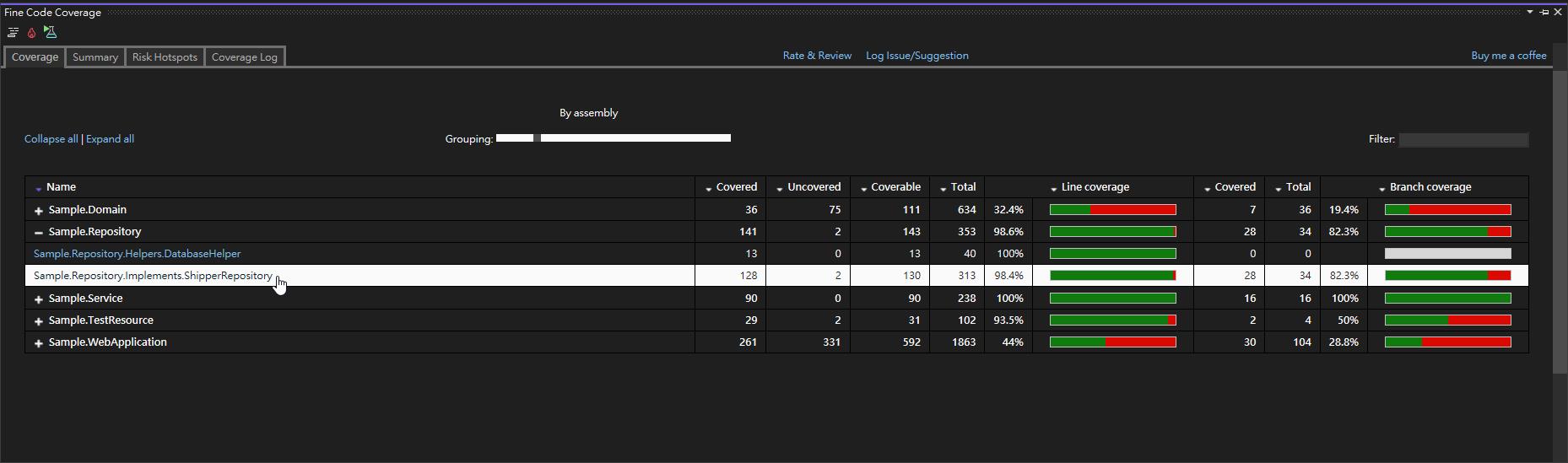 接著開啟 Fine Code Coverage 視窗就可以看到 Code Coverage 報告