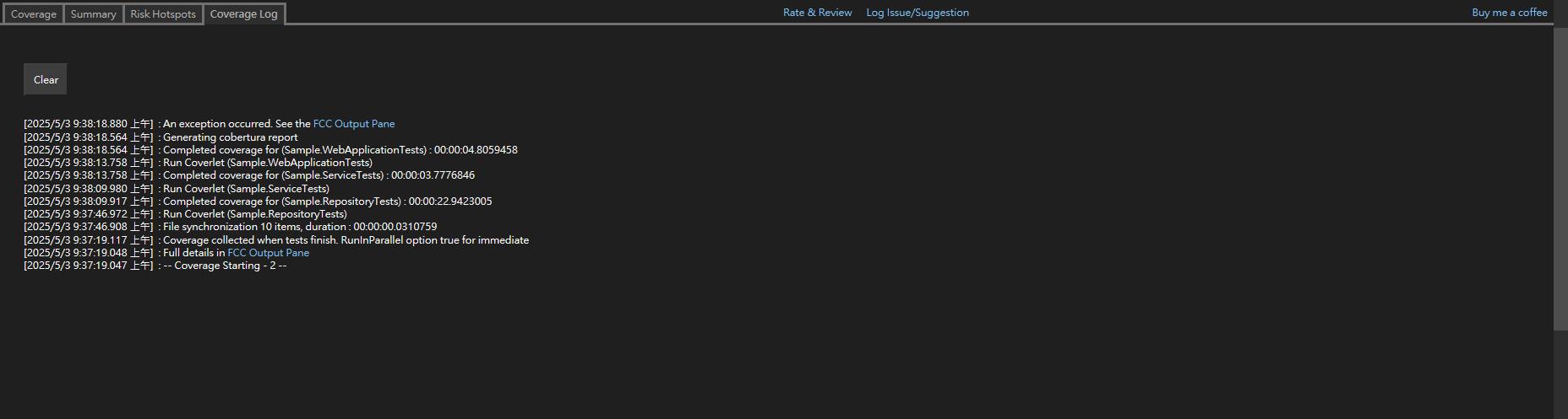 以前開發 .NET Framework 時期還有個 AxoCover 工具可以取得 Code Coverage,但是這個工具就無法應用在 .NET Core 專案。曾經有一段時間我是透過 CLI 下指令去取得 Code Coverage 與產生報告檔案,但過了一陣子後就有同事跟我說有個 Visual Studio Extension 可以取得 Code Coverage 並與 Editor 有做整合,可以在 Editor 裡就能以顏色標註覆蓋範圍,這工具就是 Fine Code Coverage。