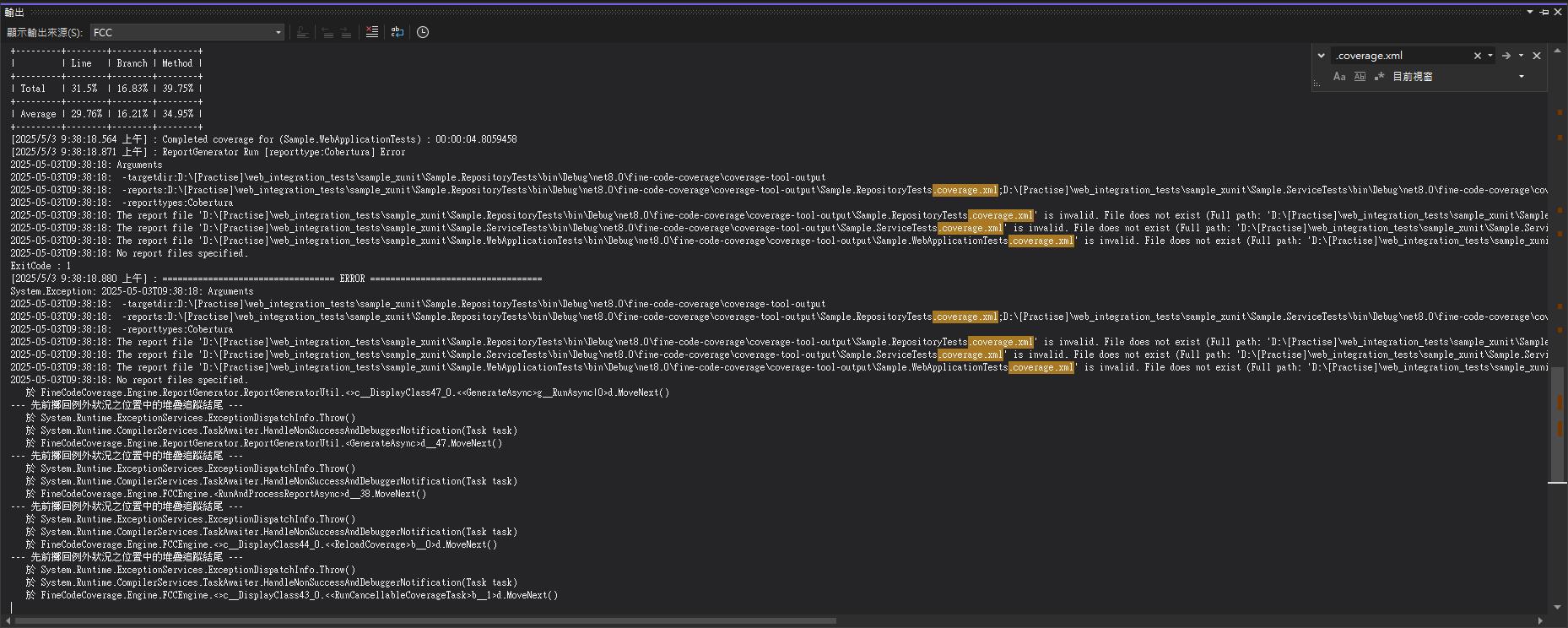 錯誤訊息裡描述著指定目錄裡的 Sample.ReposotoryTests.coverage.xml 及 Sample.ServiceTests.coverage.xml 及 Sample.WebApplicationTests.coverage.xml 檔案