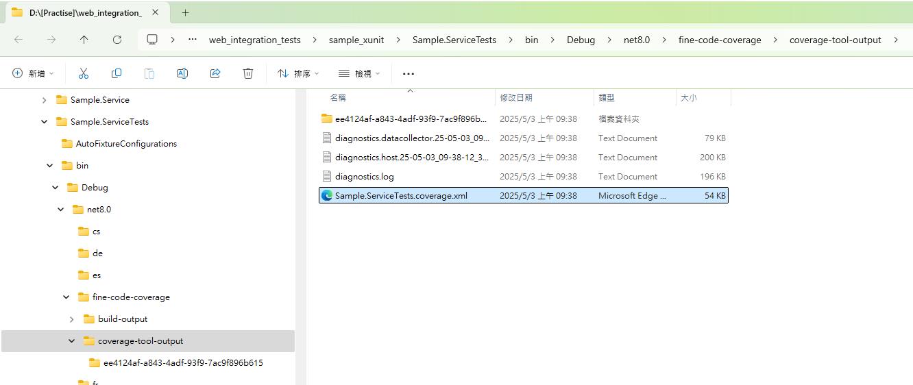 然後實際開啟檔案總管並且到指定目錄裡是有看到 Sample.ServiceTests.coverage.xml 檔案