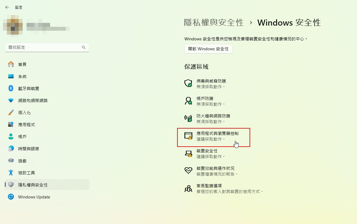 Windows 設定 → 隱私權與安全性 (Windows 安全性) → 應用程式與瀏覽器控制