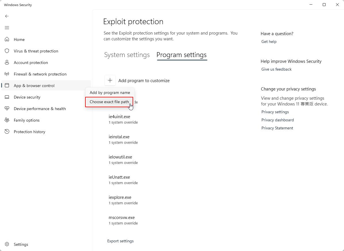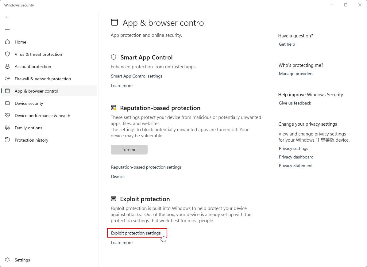 Windows Security → App & browser control → Exploit protection → Exploit protection settings