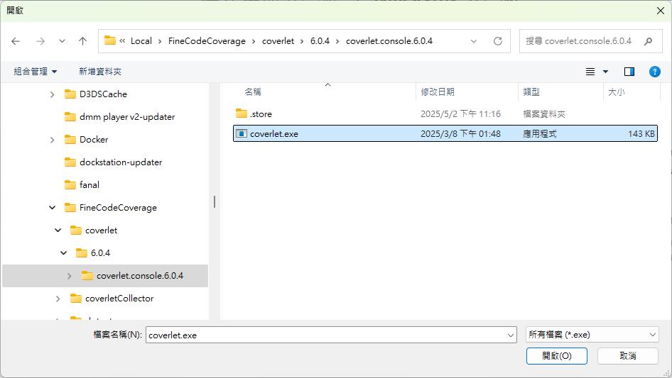 一般路徑位置會是 C:\Users\使用者名稱(記得要改)\AppData\Local\FineCodeCoverage\coverlet\6.0.4\coverlet.console.6.0.4
