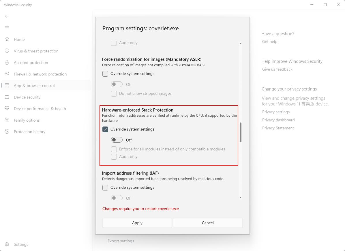 然後開啟的 Program settings: coverlet.exe 視窗裡,將 Hardware-enforced Stack Protection 項目勾選 Override system settings,並將開關調整為 Off