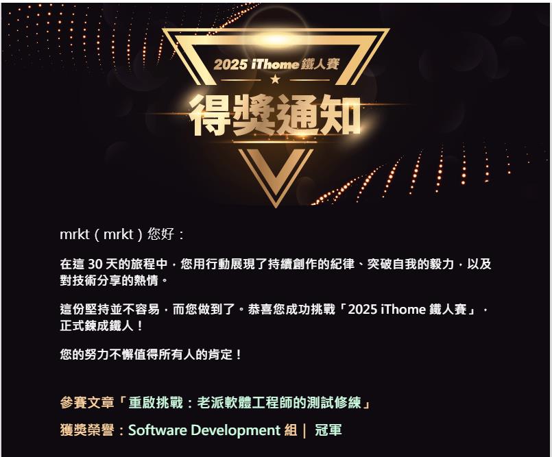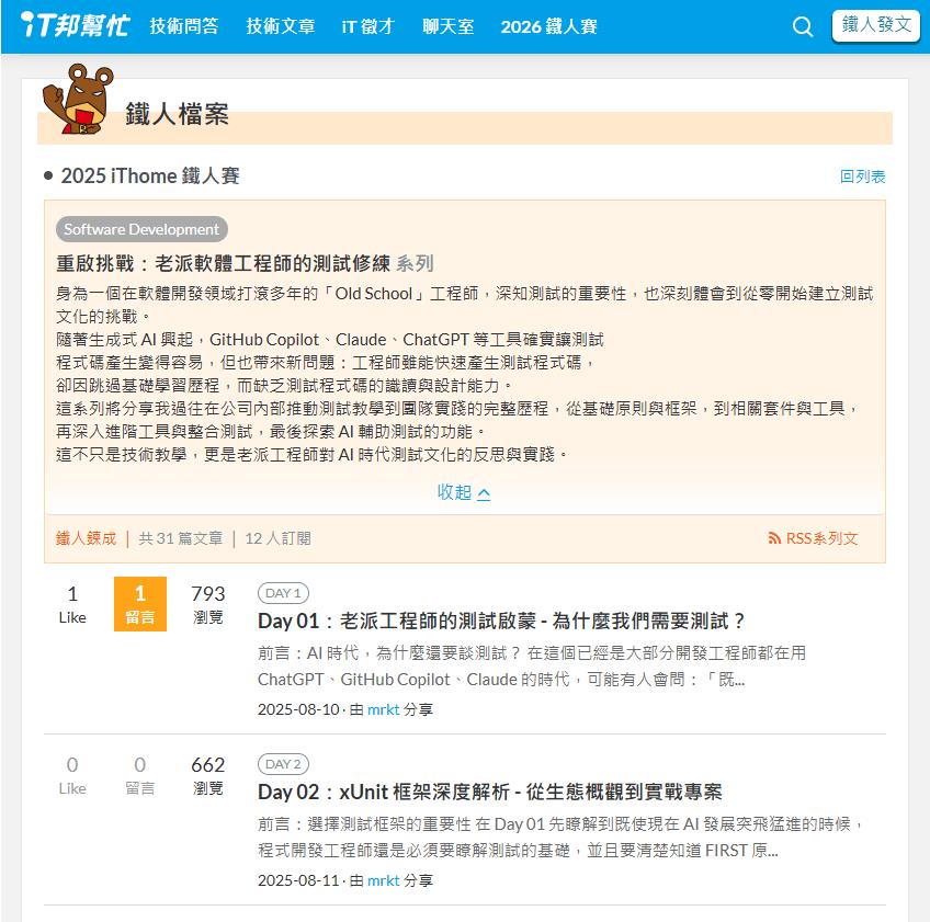 「2025 iThome 鐵人賽 - 重啟挑戰:老派軟體工程師的測試修練」