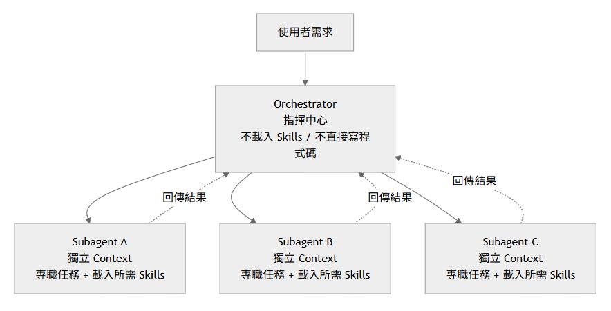 | Context Window 壓力(5 Skills ≈ 39K) | 各 Subagent 在獨立 Context 中載入少量 Skills(~12K) |