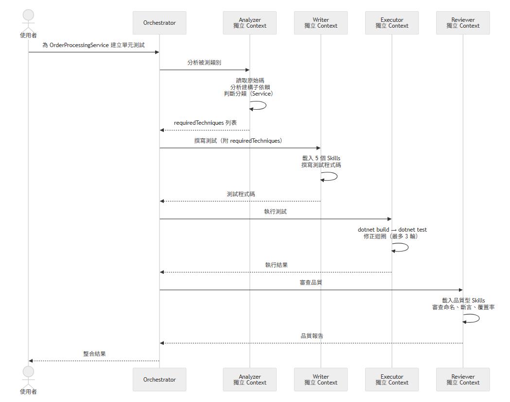 對 dotnet-testing-agent-skills 來說,Agent Orchestration 解決了從第一天就存在的核心問題:讓 AI 自己決定載入哪些 Skills、在獨立的 Context 中深入理解每個 Skill、按照明確的流程完成從分析到審查的完整工作。