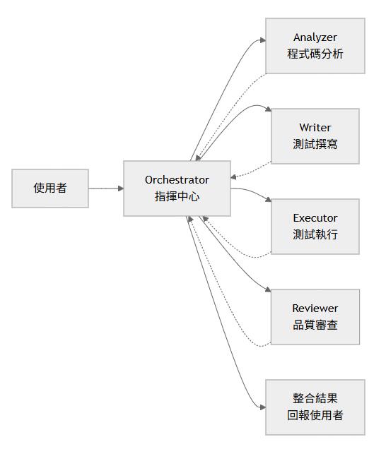 使用者 → Orchestrator → Analyzer → Writer → Executor → Reviewer → 使用者