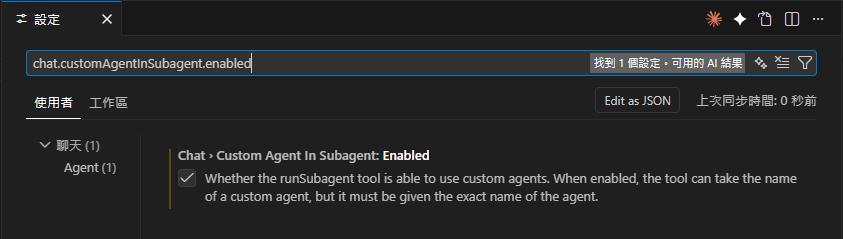 chat.customAgentInSubagent.enabled | 允許 custom agents 被其他 agent 調用 | false |