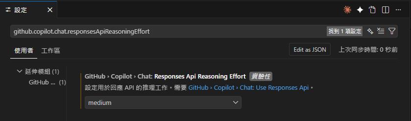 github.copilot.chat.responsesApiReasoningEffort | AI 推理深度(low / medium / high) | medium |