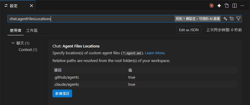 chat.agentFilesLocations | Agent 檔案搜尋路徑(可設定多個) | — |