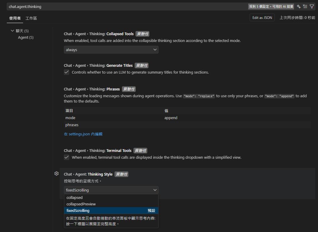 透過 chat.agent.thinkingStyle 設定,可以選擇 AI 思考過程的顯示方式: