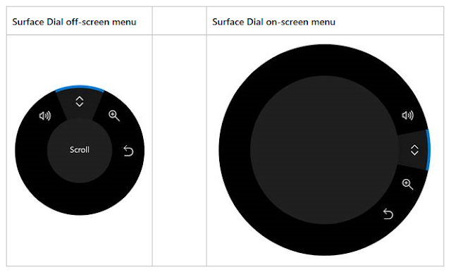 顯示的方式根據 Surface Dial 是否有放在 screen 上有不同的顯示方式,參考如下: